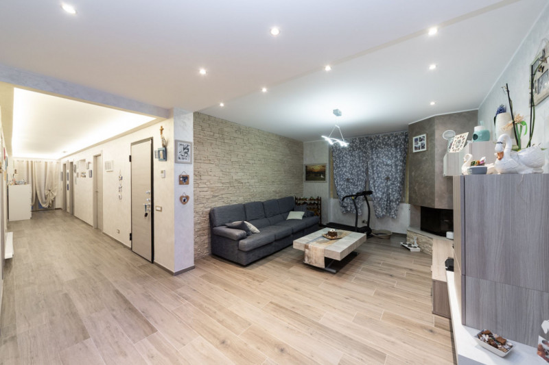 Gli interni sono luminosi grazie alle grandi finestre con infissi moderni e grate antintrusione; il soggiorno doppio accoglie gli ospiti con finiture raffinate tra cui una parete effetto pietra naturale, camino angolare moderno e illuminazione a faretti LED incassati sul soffitto. Gli spazi risultano ottimamente distribuiti lungo un corridoio principale che conduce alle camere da letto spaziose ed alla cucina abitabile (eventualmente separabile), garantendo praticità sia negli eventi conviviali che nella vita quotidiana.