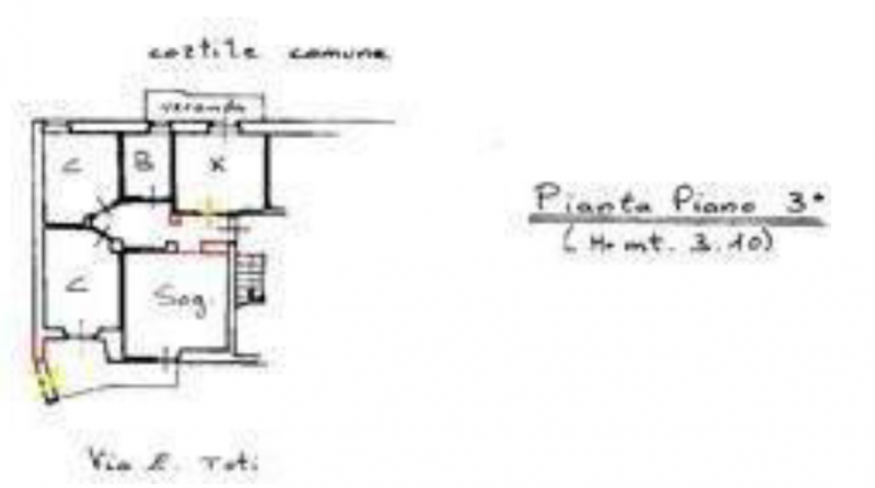 ampio ingresso, cucinotta, 4 camere, bagno finestrato, balcone con accesso diretto al cortile a mezzo scala con pochi gradini.