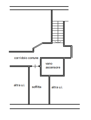 Alloggio al piano quarto (5° f.t.), composto di ingresso, cucina, due camere, ripostiglio e servizi ed annessa cantina, al piano interrato.