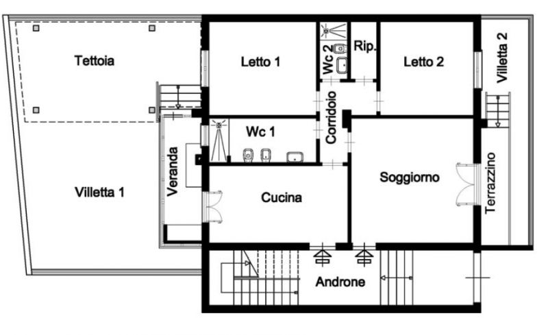 Doppio ingresso, salone pari a tre vani con balcone su strada principale, soggiorno, cucina abitabile, veranda pari a due vani con terrazzo al piano di mq 40, 2 camere da letto, ripostiglio, wcd e wcb.