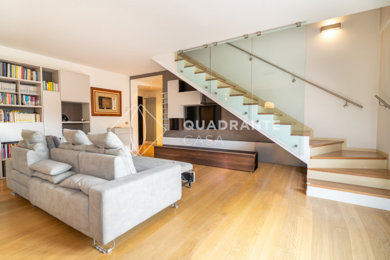 L’appartamento si distingue per gli ambienti luminosi e moderni: il soggiorno open space è caratterizzato da ampie vetrate che affacciano su una zona verdeggiante, pavimentazione in parquet chiaro e una raffinata scala interna con parapetto in vetro. La zona living è arricchita da arredi su misura ed elementi di design contemporaneo che donano eleganza all’ambiente.