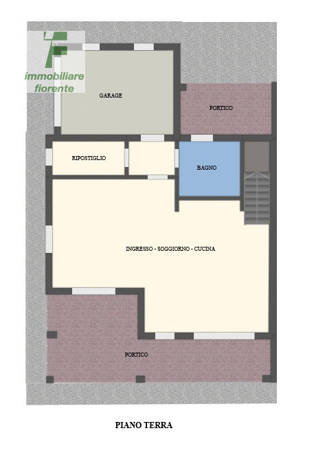 Piano terra: 2 portici (lato nord e lato sud), soggiorno cottura di mq 55, bagno lavanderia locale servizi e impianti, disimpegno, ampio garagedi mq 20 con accesso interno .