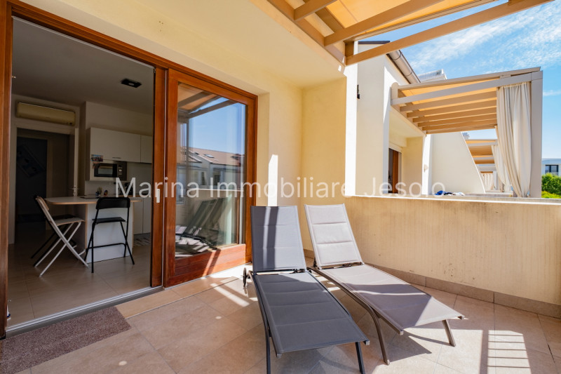 (Per INFO Mara 3481536890) A Jesolo, tra piazza Brescia e Piazza Drago, a soli 10 minuti a piedi dalla spiaggia, proponiamo un grazioso appartamento, inserito in un residence con piscina. L'appartamento è sito al primo piano ed apre il suo ingresso sul soggiorno con cucina, ampio ed arioso, con travi a vista sbiancate, che accede direttamente al terrazzo coperto abitabile con una piacevole vista sulla piscina del residence. La zona notte conta una camera padronale e una cameretta con due letti a castello. Bagno con doccia finestrato e dotato di attacco per lavatrice. L'appartamento è completo di posto auto in area esterna al residence adibita a parcheggio ed, inoltre, sono disponibili altri posti liberi all'interno del residence ad uso esclusivo dei condomini. L'appartamento è completo di riscaldamento autonomo con caldaia a gas e radiatori, che lo rende quindi un'ottima dimora da vivere tutto l'anno. Raffrescamento tramite split in pompa di calore, serramenti in legno doppio vetro con zanzariere e scuri in legno. Classe energetica C. Ceduto completo di arredamento, pronto quindi per la stagione 26. Rif. MA7357