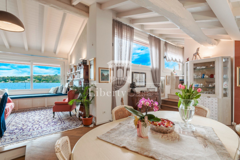 L’attico si raggiunge comodamente tramite ascensore; la proprietà si apre su un elegante ingresso che si affaccia armoniosamente sia sulla versatile stanza hobby, utilizzabile anche come terza camera da letto, servita da bagno finestrato con doccia e preceduta da un pratico disimpegno armadiato, sia sulla raffinata scala interna che conduce alla meravigliosa zona giorno: uno spazio unico, studiato nei minimi dettagli, arricchito da travi a vista e soffitti in cui la protagonista assoluta è la grande parete vetrata affacciata sul lago, che trasforma la luce in emozione e regala panorami e tramonti indimenticabili. Non è solo una finestra: è uno stile di vita. La zona giorno è completata da una cucina separata, dotata di un suggestivo tavolo panoramico rialzato che consente di pranzare e cenare con una vista impareggiabile. La cucina dispone inoltre dell’autorizzazione per l’apertura di un velux a tetto, offrendo la possibilità di aumentare ulteriormente la luminosità. Un comodo disimpegno conduce alla zona notte, composta da due camere matrimoniali e da un bagno finestrato con vasca. Grazie alla presenza della stanza hobby e del secondo bagno, l’appartamento può essere quindi considerato come una soluzione con tre camere e due bagni, ideale per famiglie o per chi desidera ambienti versatili.