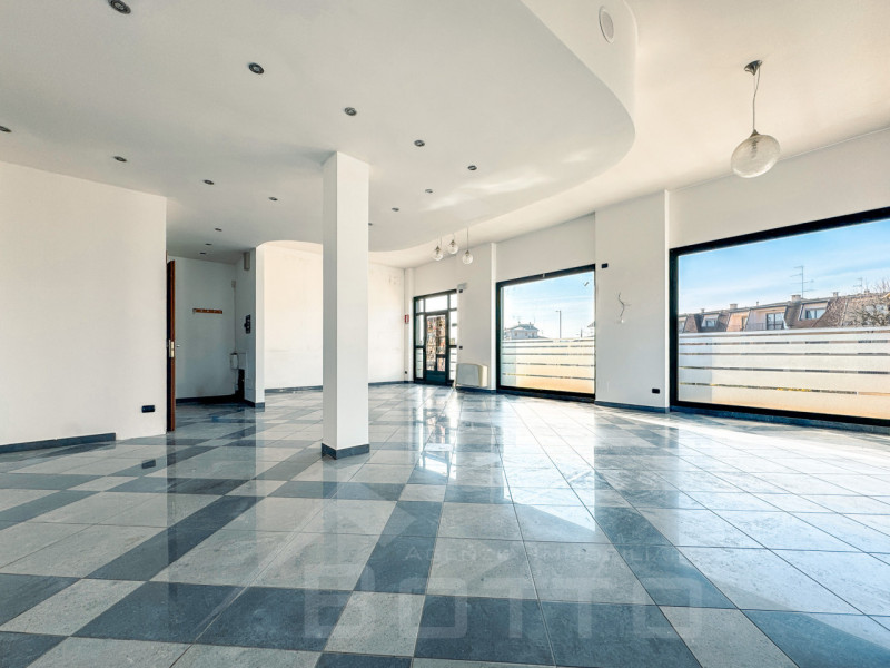 Il negozio si estende al piano terra su una superficie di 75 mq e l'ampio spazio espositivo beneficia di tre vetrine luminose che offrono ottima visibilità, affacciandosi sotto i portici della piazza. Il locale è collegato a un ulteriore ambiente più piccolo sul retro, ideale per uso ufficio o disimpegno.