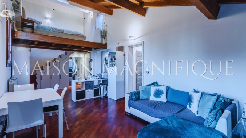 L’ingresso si apre su una zona giorno luminosa con sala e cucinotto separato, uno spazio funzionale e ben organizzato. Al piano principale si trova anche il bagno, mentre una scala conduce al soppalco, dove è stata ricavata la camera da letto con cabina armadio, garantendo privacy e una distribuzione intelligente degli ambienti.