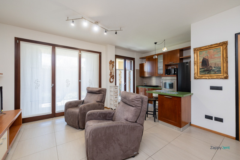 L'appartamento è caratterizzato da ambienti luminosi grazie alle ampie vetrate che affacciano su un comodo terrazzino coperto, perfetto per momenti di relax. Gli interni sono ben tenuti e con finiture moderne: pavimentazione in gres porcellanato dai toni neutri, infissi in legno con doppi vetri ed eleganti arredi su misura tra cui una parete attrezzata bianca completa di scrivania integrata. La zona giorno dispone inoltre di un divano letto verde dal design contemporaneo che ottimizza lo spazio abitativo.