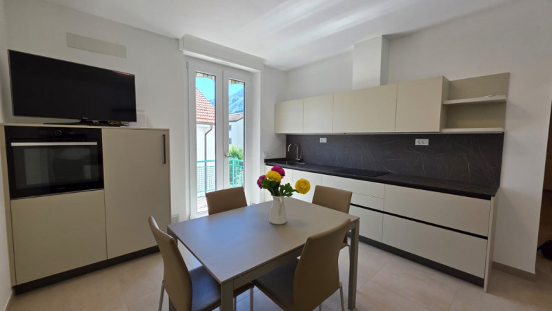 All’ingresso troviamo una cucina soggiorno totalmente nuova, dotata di balcone e arredata con elettrodomestici moderni, cucina nuova di fabbrica, tavolo, sedie e televisore da 40” nuovo.