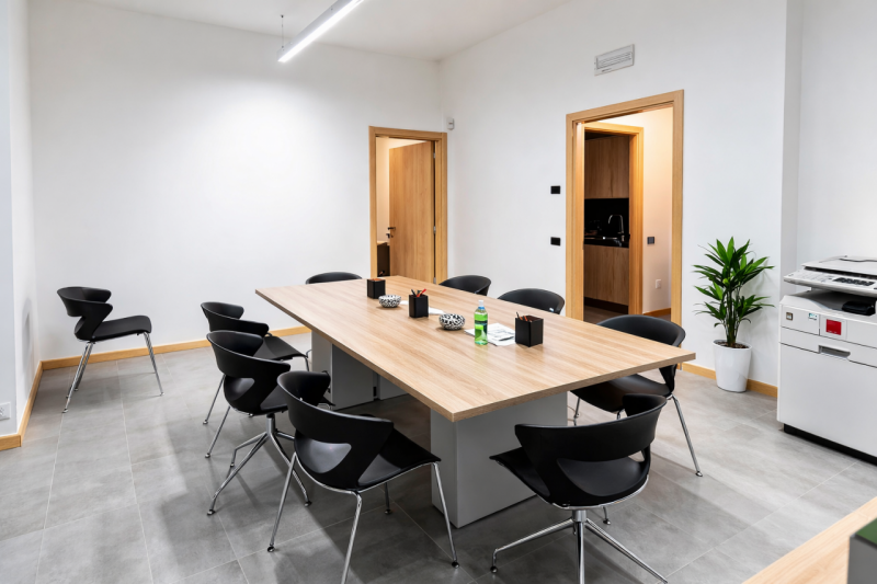 L’ufficio è composto da ingresso con reception, cinque uffici indipendenti di ampia metratura, una sala riunioni comoda e ben sfruttabile, locale archivio, cucina attrezzata e doppi servizi. Gli spazi consentono di lavorare comodamente con più postazioni (8–9), mantenendo ordine, privacy e comfort.